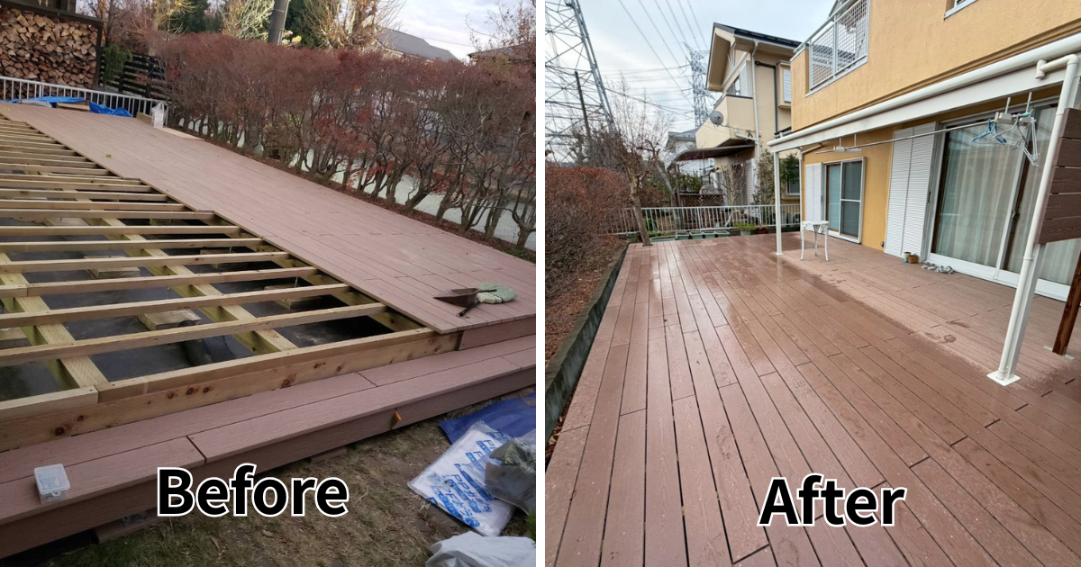 庇(ひさし)付きウッドデッキの張替え施工事例|広いデッキを“外のリビング”に整えるリフォーム【エムズ工業】