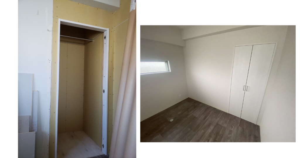 最初はボードがむき出しだった収納も、工事を進めていくと、清潔感のあるクローゼットに。